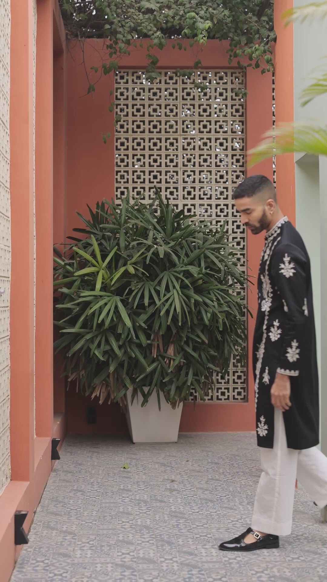 This striking black kurta commands attention with its detailed ivory embroidery that runs elegantly across the front, sleeves, and neckline. The traditional patterns are elevated by sharp tailoring, creating a look that’s both sophisticated and bold. Paired with crisp ivory trousers, this ensemble blends timeless elegance with a modern edge — perfect for festive occasions, evening gatherings, or wedding celebrations.